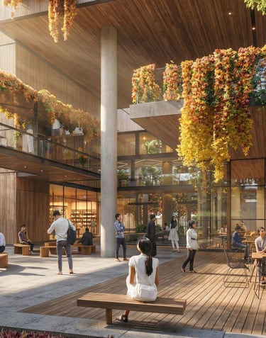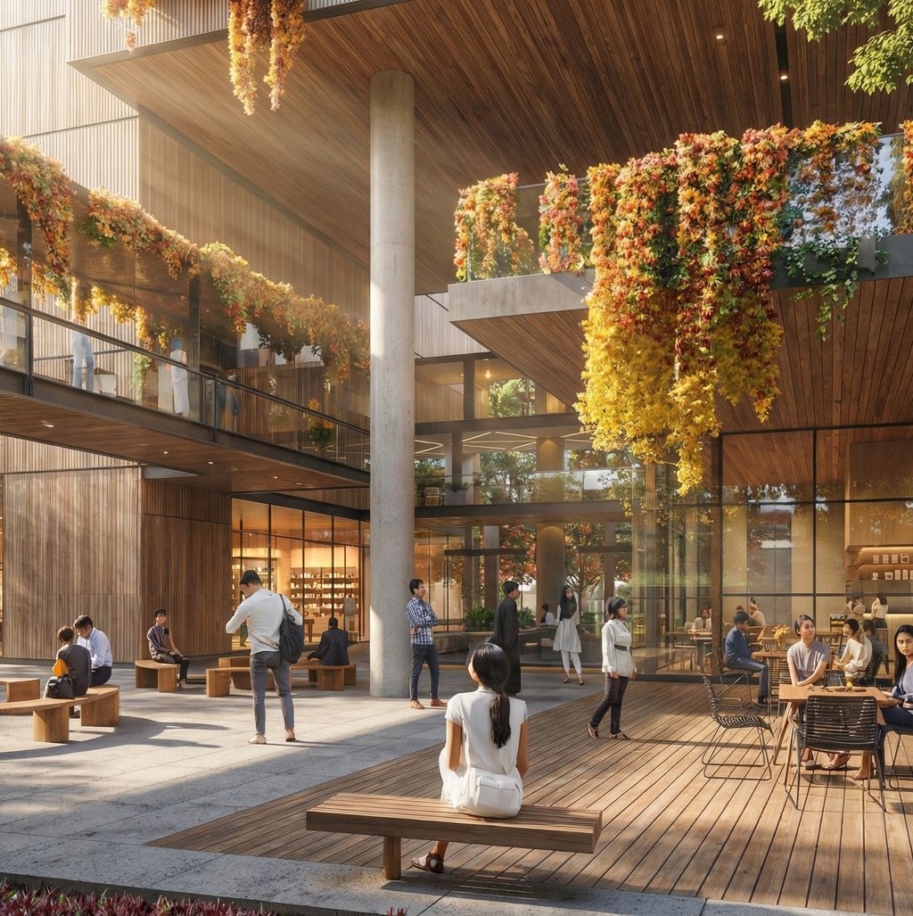 Tropical vibrancy meets thoughtful design: a commercial center wrapped in lush landscape, with open-air cafes tucked beneath palms, elevated walkways tracing the canopy, and the constant hum of people enjoying it all. Here, the boundary between built and natural simply disappears.
