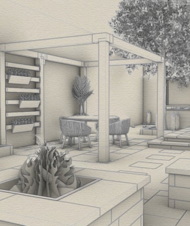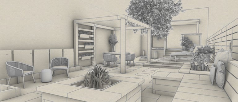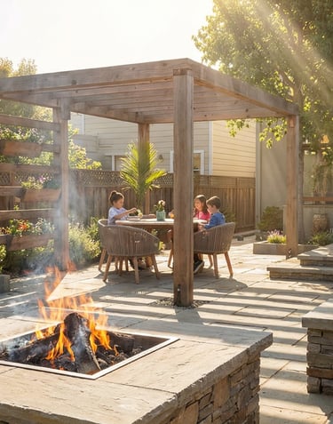 A backyard built for lingering—warm firepit, overhead pergola, and built-in seating that invites conversation to stretch deep into the evening, all surrounded by thoughtful planting. The greenery softens every edge, creating a space that feels both intimate and alive. IHere, every night feels like an occasion, even when it's just you and the fire.