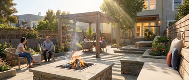 A backyard built for lingering—warm firepit, overhead pergola, and built-in seating that invites conversation to stretch deep into the evening, all surrounded by thoughtful planting. The greenery softens every edge, creating a space that feels both intimate and alive. IHere, every night feels like an occasion, even when it's just you and the fire.